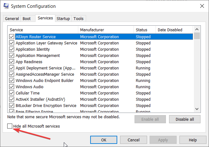 - Uncheck the box beside Hide all Microsoft services.