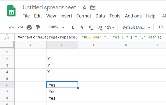 - Copy this formula: =ArrayFormula(regexreplace(” “&B2:B4&” “,” Yes | Y | Y “,” Yes”)).