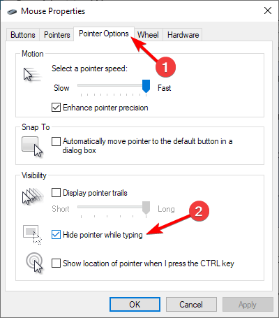- Head to the Pointer options and check the Hide pointer while typing.