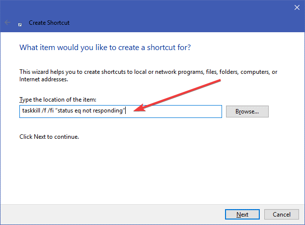 - Paste the command: taskkill /f /fi “status eq not responding”