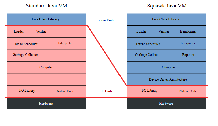 Squawk, just like most Java bytecode interpreters/virtual machines, is written in low-grade programming languages like C++ and Assembly. However, the core aspects of the software are written in Java, which makes it a “meta-circular interpreter”.