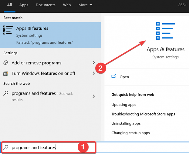 - In the Search field, type Programs and features, and click the Apps & features option.